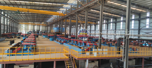 原矿经过三段一闭路破碎系统,采用一段闭路磨矿流程,磨矿细度为-100目占62%,经过一次粗选一次扫选,粗精矿浓缩脱水后再磨,磨后精矿进行三磨四选后进行湿式筛分,正目石墨经过一磨两选后进入压滤烘干系统,正目产品进行分目包装,筛分负目经过一次浓缩浮选,再进行三磨四选,进入压滤烘干包装系统,尾矿湿排至尾矿库。