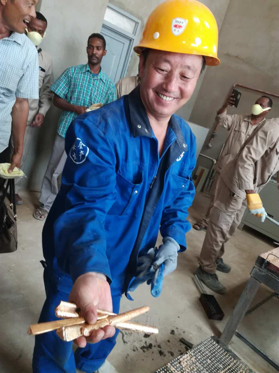 非洲200吨金矿于2017.7.17日第一批金条顺利出炉,矿业部,安全部,矿主及金鹏和在场的所有的人都露出幸福笑脸,金鹏公司在茫茫沙漠中又建造一座金库!