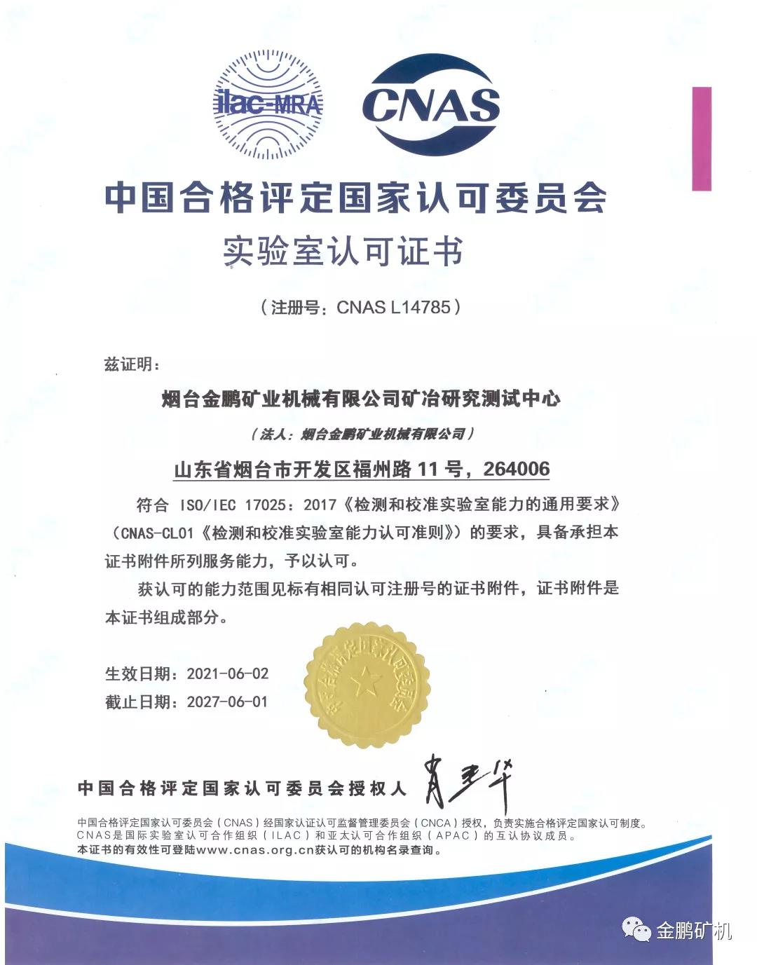 近日,烟台金鹏业机械有限公司矿冶研究测试中心成功通过了中国合格评定国家认可委员会(下称CNAS)的审核,并获得实验室认可证书。标志着金鹏矿机矿冶研究测试中心的质量管理体系完全符合国际标准,技术能力达到了国际化先进水平。