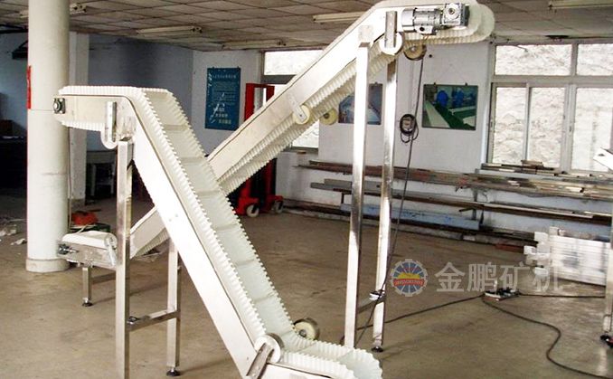 波状挡边输送带中以大倾角波状挡边输送带最有名,大倾角波状挡边输送带又叫裙边隔板输送带,是由基带、挡边、横隔板3部分组成。挡边起防止物料测滑撒落的作用。为便于绕过滚筒,档边设计成波纹状;横隔板的作用是承托物料,为了实现大倾角输送,采用T型TC型。档边和横隔板是用二次硫化的方法与基带连接的,具有很高的连接强度。