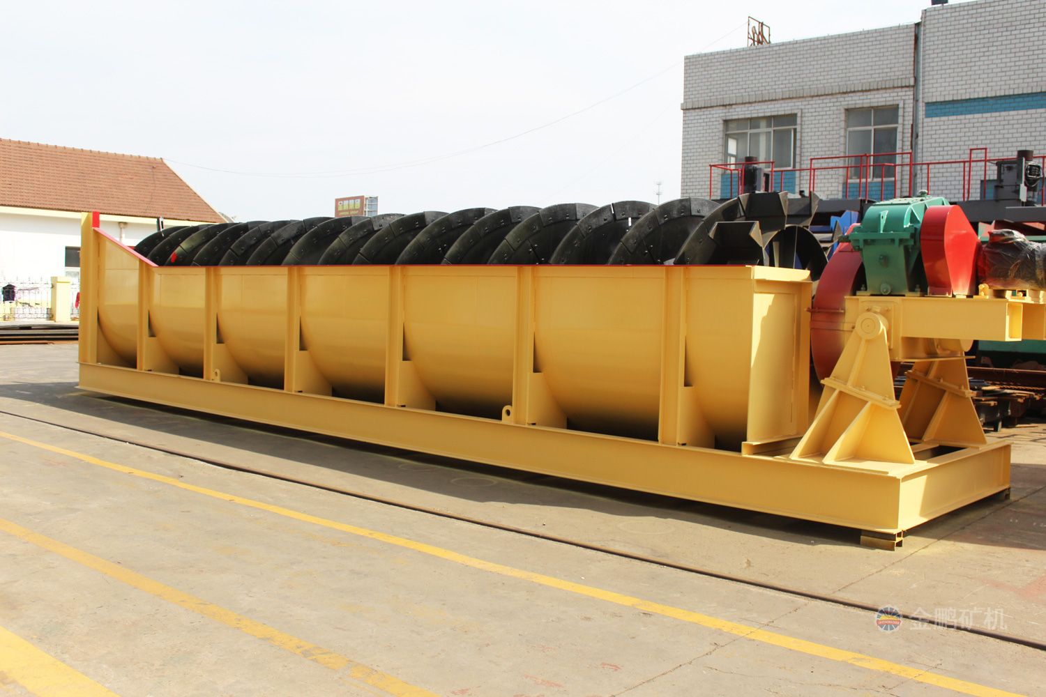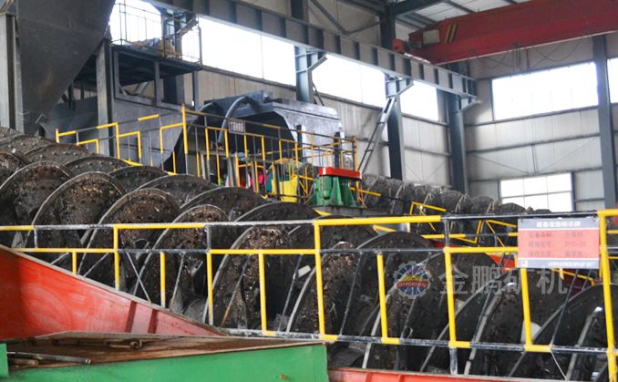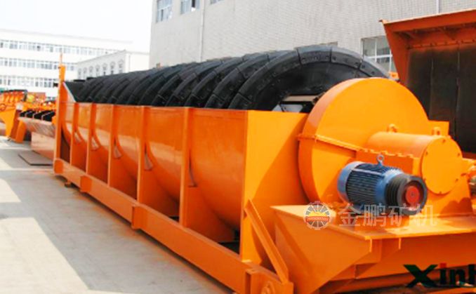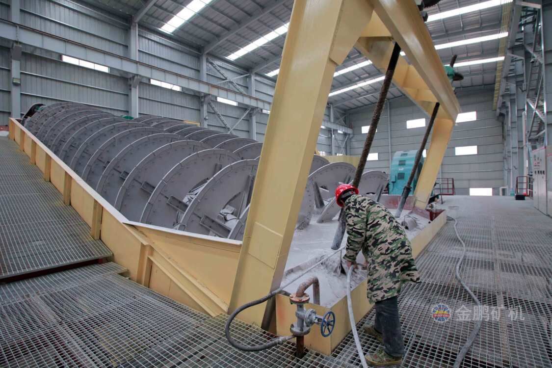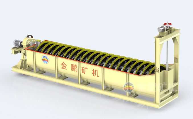 高堰式螺旋分级机采用将磨细后的矿浆从位于沉降区中部的进料口给入水槽,倾斜安装的水槽下面是矿浆分级沉降区,螺旋低速转动,对矿浆起搅拌作用,使细颗粒悬浮到上面,流到溢流堰处溢出。粗颗粒沉到槽底,由螺旋输送到排料口作为返砂排出。溢流堰的位置高于螺旋轴下端的轴承中心,低于溢流端螺旋上缘。