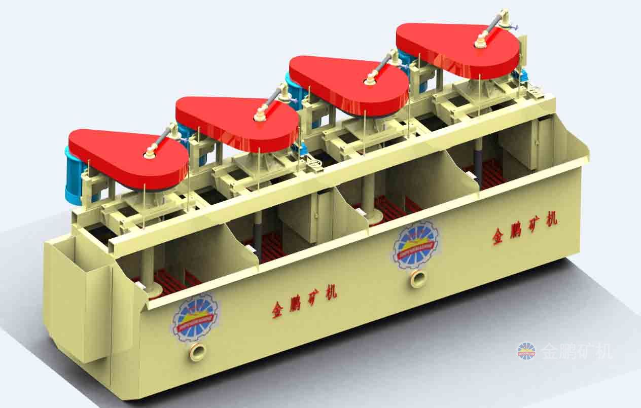 当浮选机叶轮旋转时,来自鼓风机的低压空气通过分配器周边的孔进入叶轮叶片间,与此同时假底下面矿浆由叶轮下部被吸入到叶轮叶片间,矿浆和空气在叶轮叶片间充分混合后,从叶轮上半部周边排出,排出的矿浆空气混合物由定子稳流后,穿过格子板,进入槽内上部区。此时浮选机内部区矿浆中含有大量气泡,而外侧循环通道内矿浆中不含气泡(或古有极少量气泡),于是内外矿浆就形成压差,在此压差及叶轮抽吸力作用下,内部区矿浆和气泡在设定的流速下起上升通过格子板,将粗颗粒矿物带到格子板上方,形成粗颗粒矿物悬浮层,而矿化气泡和含有较细矿粒的矿浆则继 续上升,矿化气泡升到液面形成泡沫层,含有较细矿粒的矿浆则越过隔板经循环通道,进入叶轮区加入再循环。