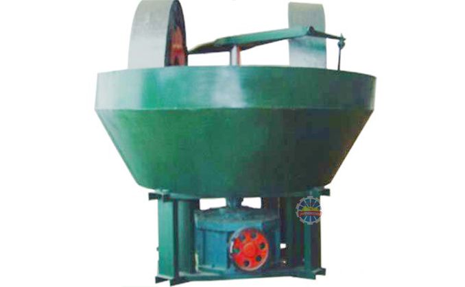 本设备采用轮动式磨矿工作方式:首先电动机将动力传递至减速机,在减速机带动下,通过大立轴将力矩传递给上方的横轴,然后经安装在横轴两端的拉杆传递至碾轮,使碾轮产生驱动力,沿横轴水平方向做逆时针旋转运动;工作时的碾轮既能围绕湿碾机大立轴公转,又能围绕碾轮中心轴进行自转,碾盘则固定不动。添加的矿石物料,在碾磨机内受到来自碾轮自身重量带来的挤压力,碾轮公转自转时与碾盘产生的巨大摩擦力,在受到反复的挤压、揉搓、研磨后,被彻底粉碎。